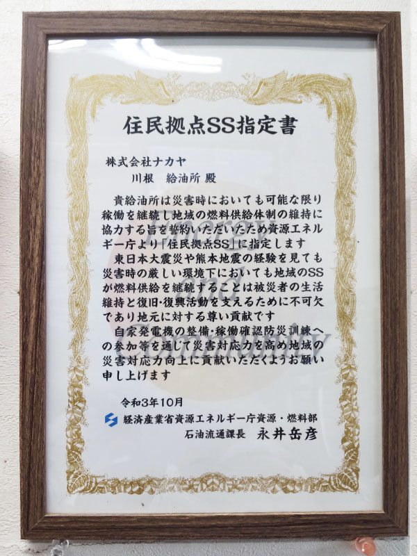 地域の燃料供給体制の維持に協力する旨を契約いただいたため資源エネルギー庁より「住民拠点SS」に指定されています。